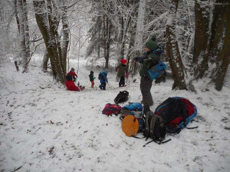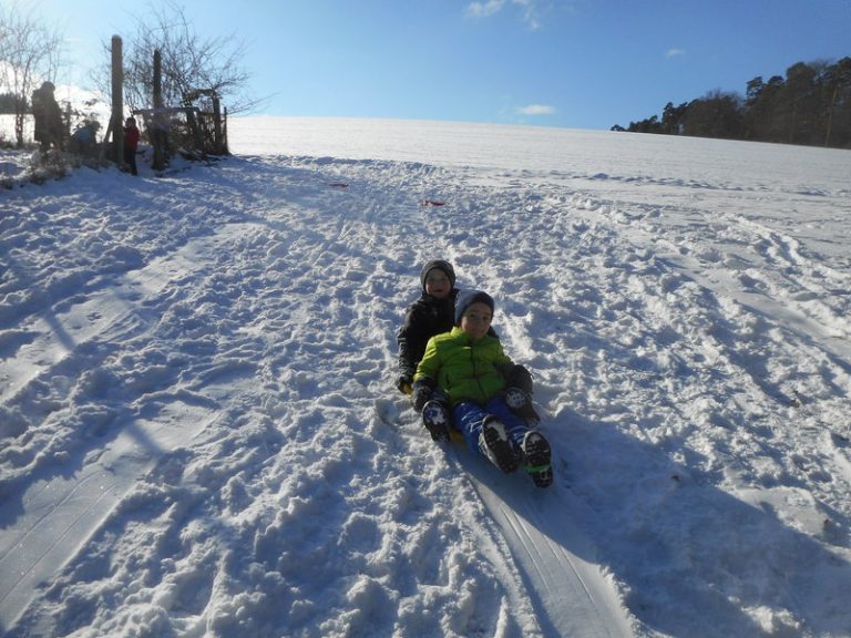 Nachdem wir im Dezember schon auf dem gefrorenen und bereiften Hang Schlitten gefahren sind, können wir das jetzt endlich auf Schnee nachholen!